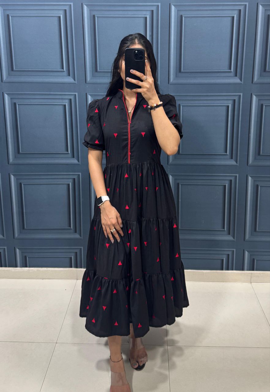 Make a bold style statement with this contemporary black tiered dress. It features a playful and eye-catching geometric print of red triangles scattered all over. The dress is designed with a smart collared neck and a contrasting red front zipper that adds a modern, edgy touch. With its on-trend puff sleeves and a flowy, multi-tiered skirt, this outfit perfectly blends comfort with high fashion, making it an excellent choice for parties, brunches, and casual outings.